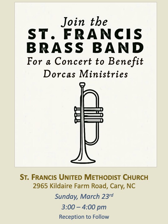 At 3pm on Sunday 23-March the Saint Francis Brass Band will perform a Benefit Concert at Saint Francis United Methodist Church in Cary, NC. All are welcome to come and hear some great brass music while helping to raise funds to support the Dorcas Ministries. There will likely be a short reception afterwards with light refreshments.